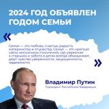 В 2024 году будет уделено особое внимание развитию семейных ценностей, укреплению института семьи и усилению мер поддержки. Семья создаёт человека и поддерживает его стремление к развитию, если членов семьи объединяют ценности, значение которых они хотят делить и с другими людьми: любовь и верность, здоровье и благополучие, почитание родителей, забота о старших и младших, продолжение рода. Особое значение имеет семья в жизни ребёнка, его становлении и поведении. В семье могут формироваться все качества личности.